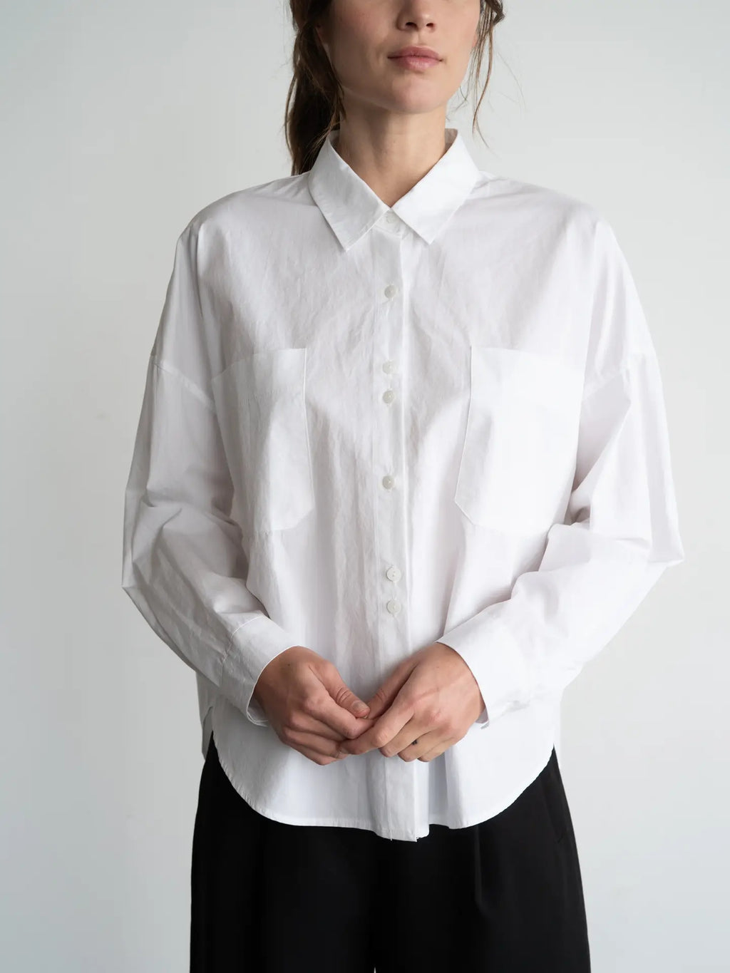 Rounded hemline for easy tucking or layering.