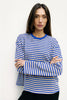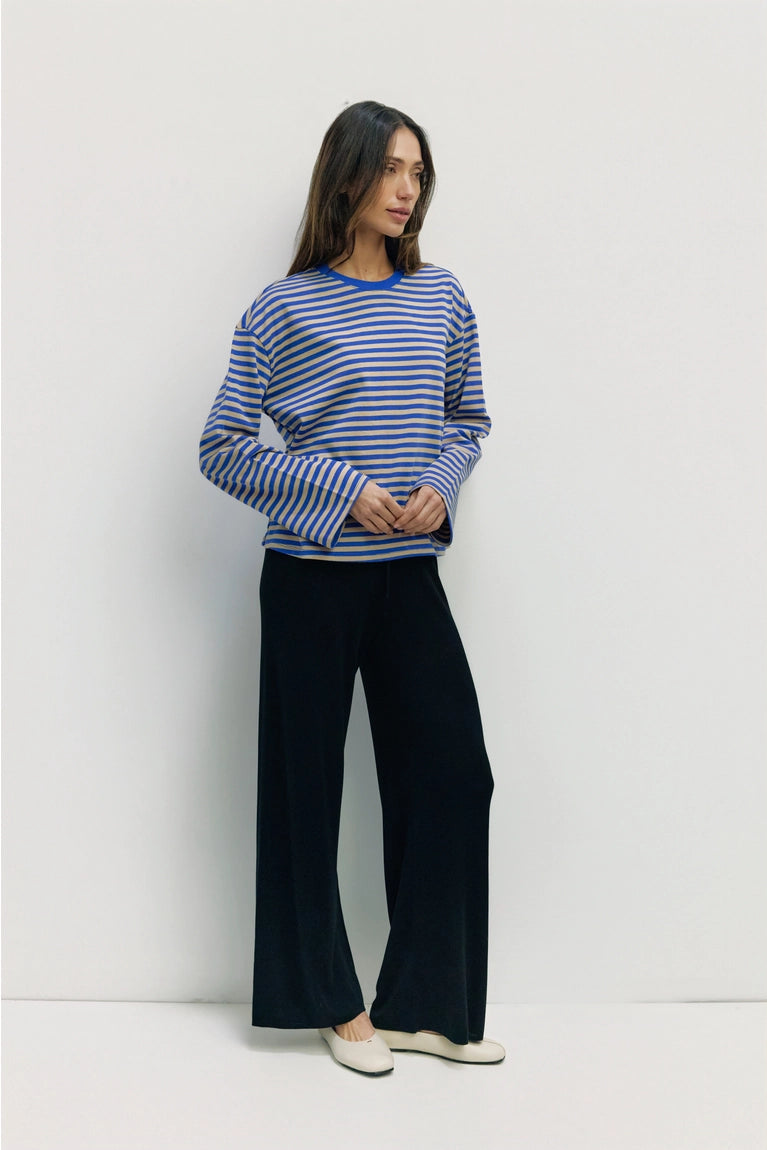The Jessie Top is a relaxed-fit long-sleeved tee made from midweight striped fabric. It features a solid color crewneck and drop shoulders for a casual, comfortable look. A versatile essential for layering or wearing on its own.