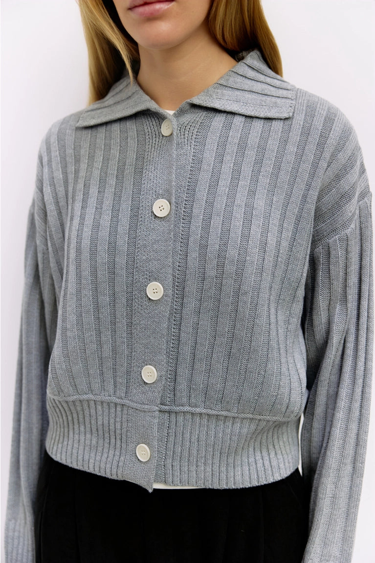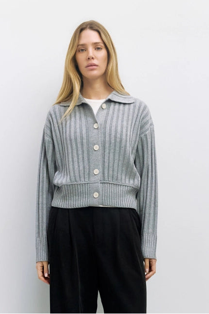 The Joni Cardigan is knitted from a heavyweight, thick-ribbed fabrication that offers structure and warmth.