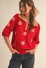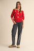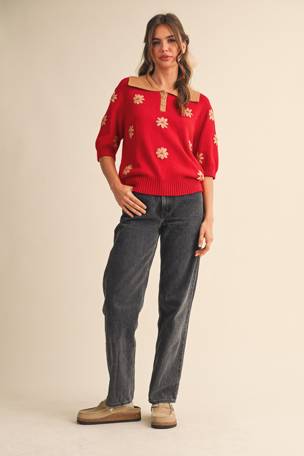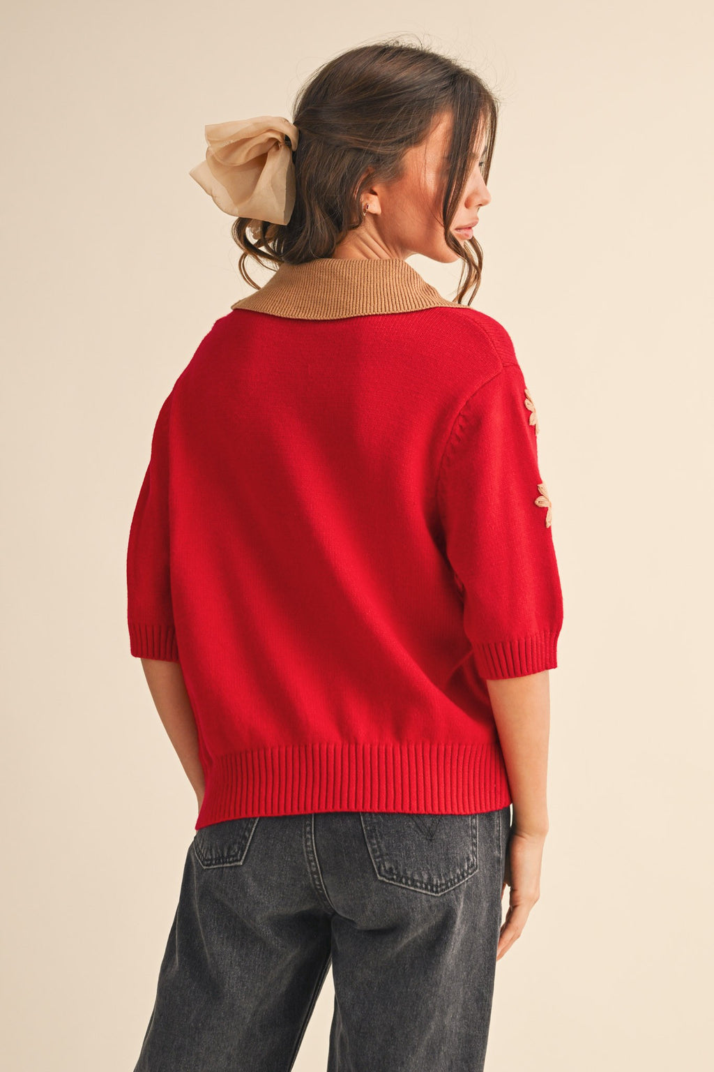 Floral hand-stitched embroidery short sleeve sweater Hand-stitched floral embroidery Collared neckline Button down placket Elbow length sleeves Ribbed cuffs and hem Waist-length fitFabric Content:43% viscose, 32% nylon, 25% poly