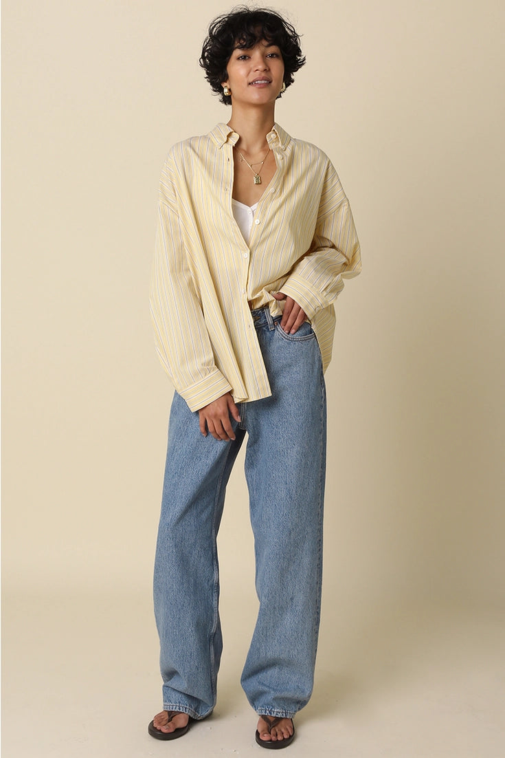 The Macy Oversized Striped Shirt features a relaxed, drop shoulder fit with an oversized silhouette and a vertical stripe pattern with a contrasting horizontal yoke on the back.