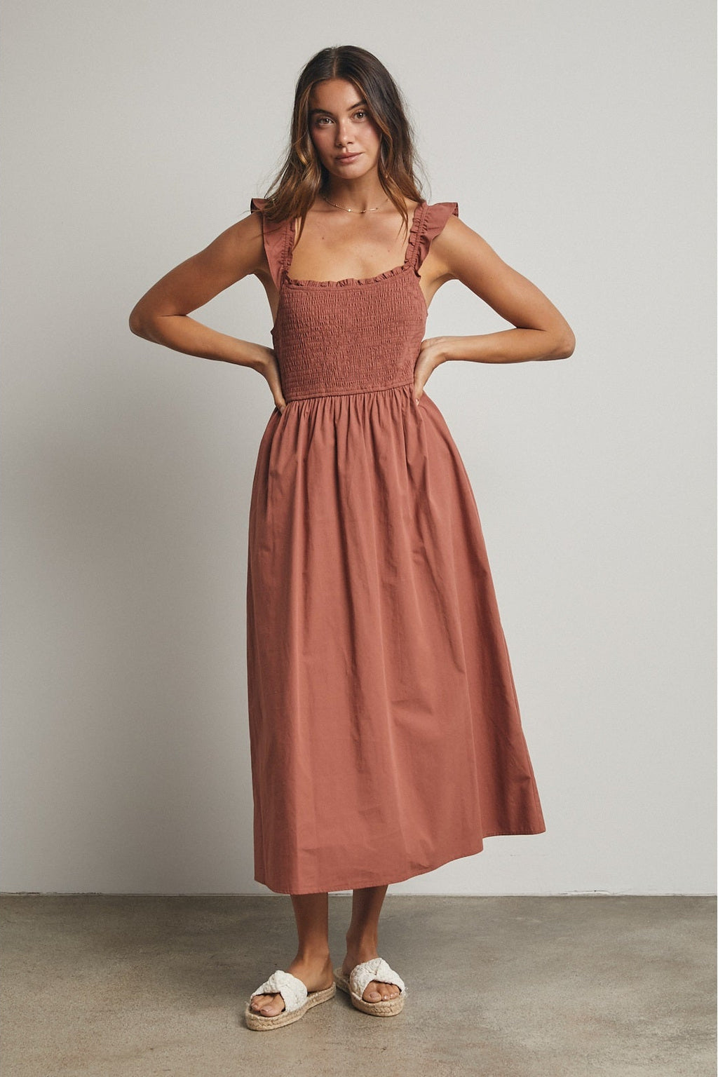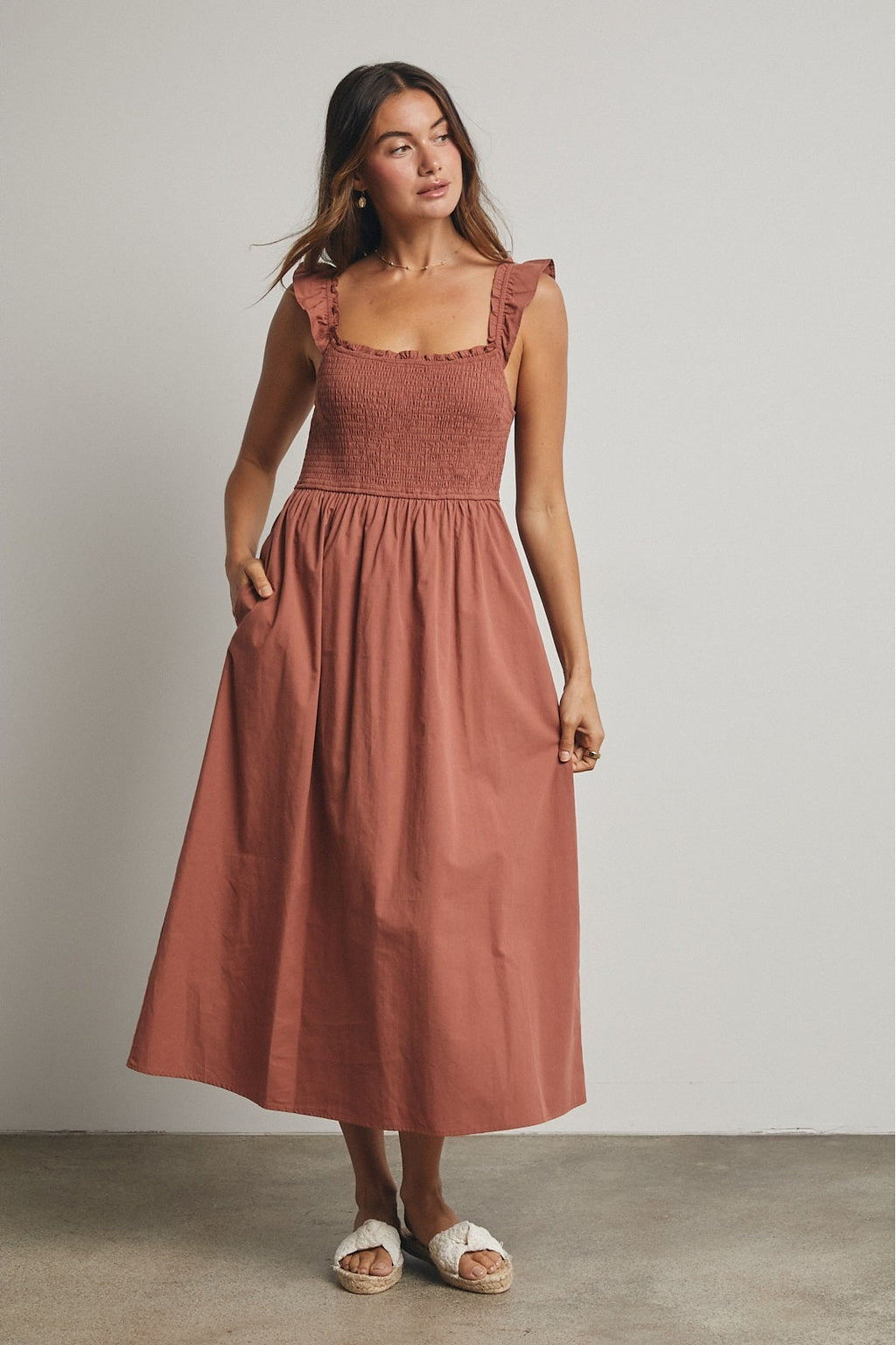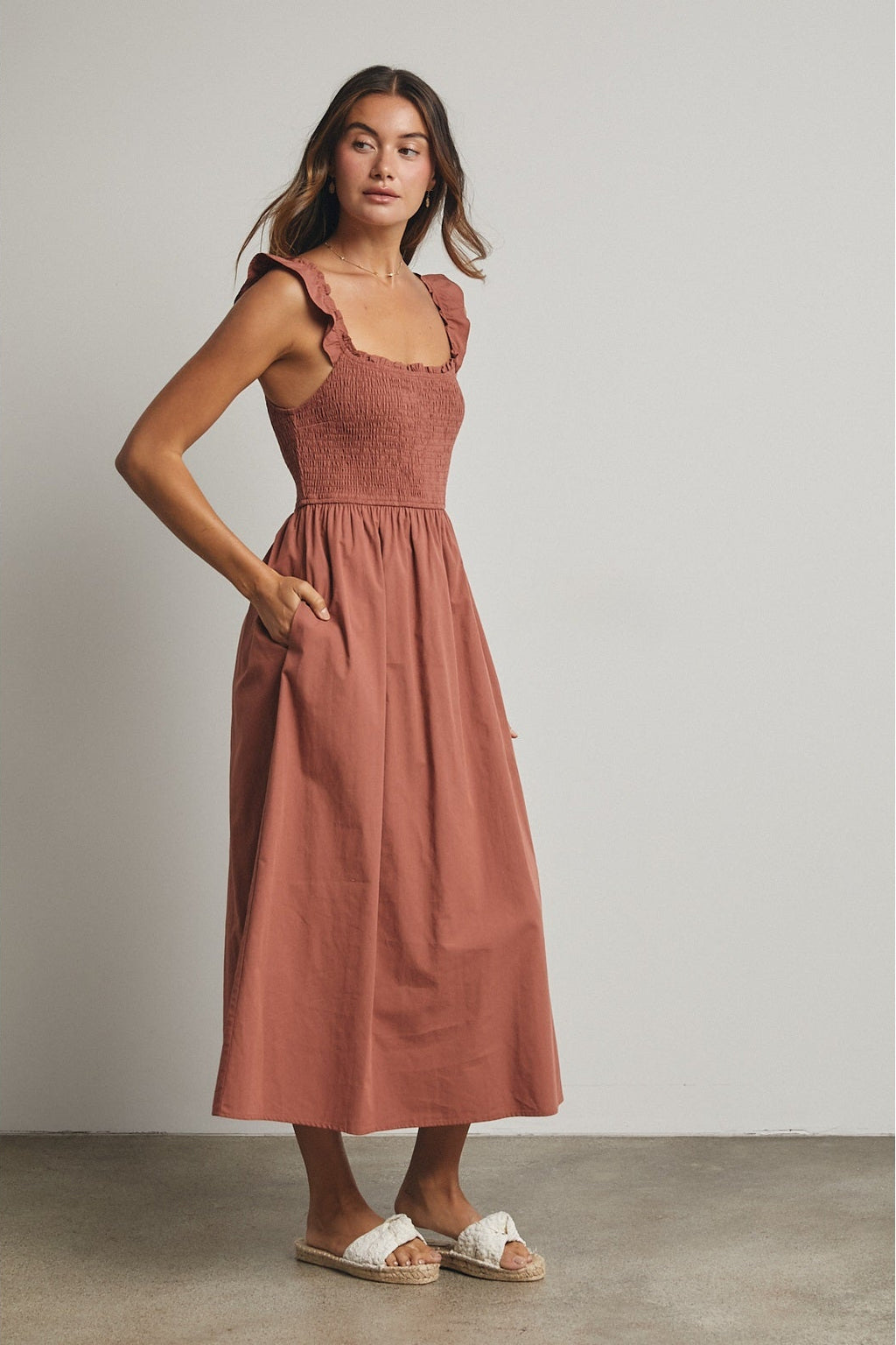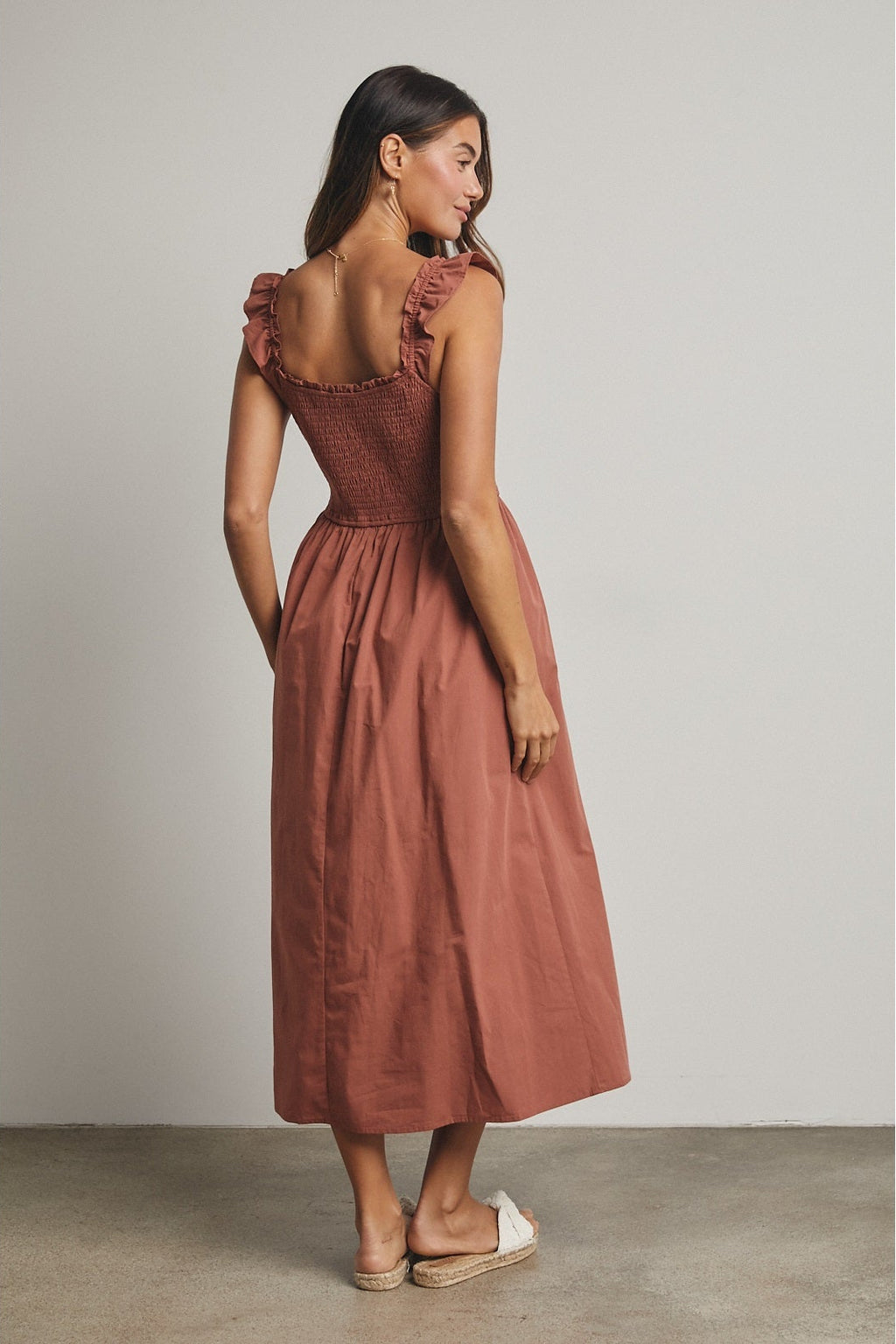 Delicate details meet everyday ease, this cotton midi dress features soft, breathable fabric, ruffle-trimmed sleeves, and a flowing silhouette that’s perfect for casual or dressy occasions.