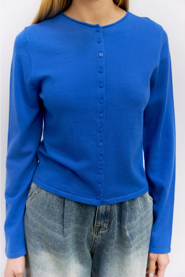 The Shea Cardigan features a cozy rolled neckline and long sleeves for a refined, comfortable look. The front button closure and midweight knit fabric make it a versatile piece, perfect for layering or wearing on its own.