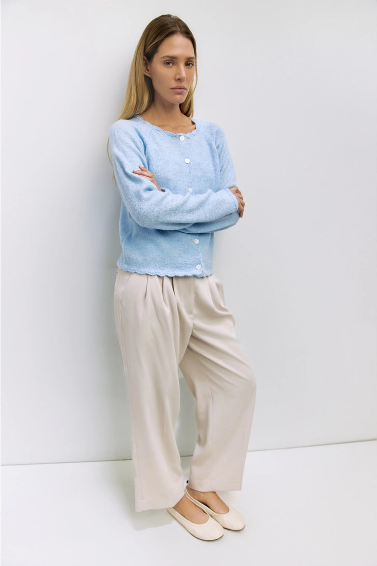The Tiffany Cardigan is crafted from a heavyweight knit with a relaxed, comfortable fit. Featuring raglan long sleeves, a crewneck, and a full button front—all finished with delicate scallop-edge detailing—it brings subtle, refined texture to a classic layering piece.