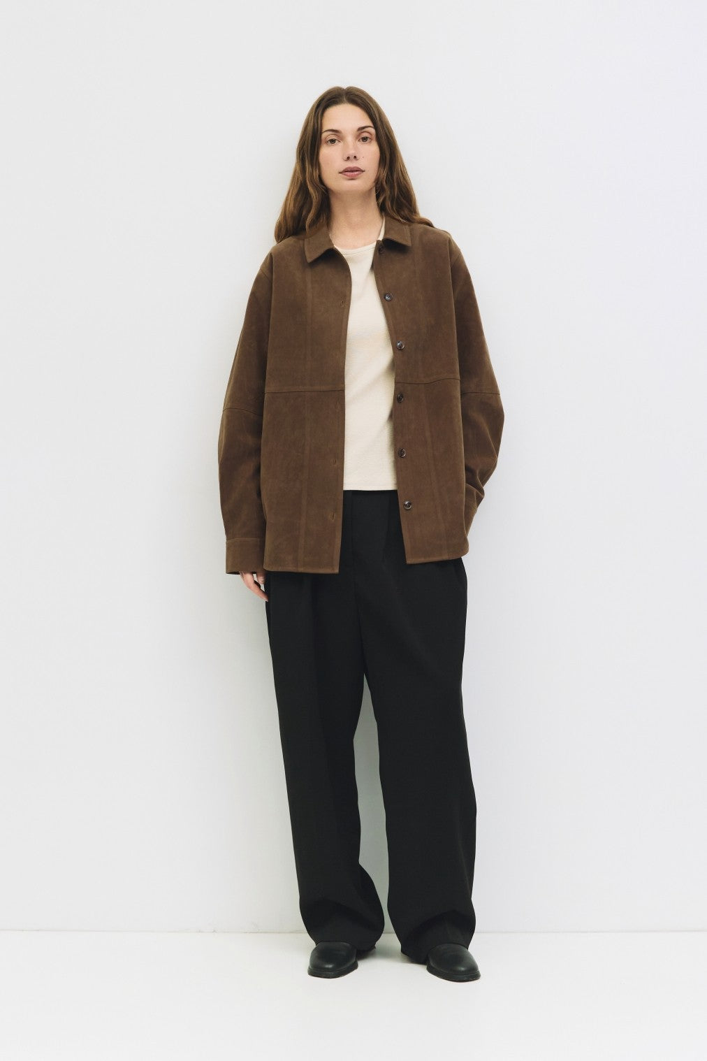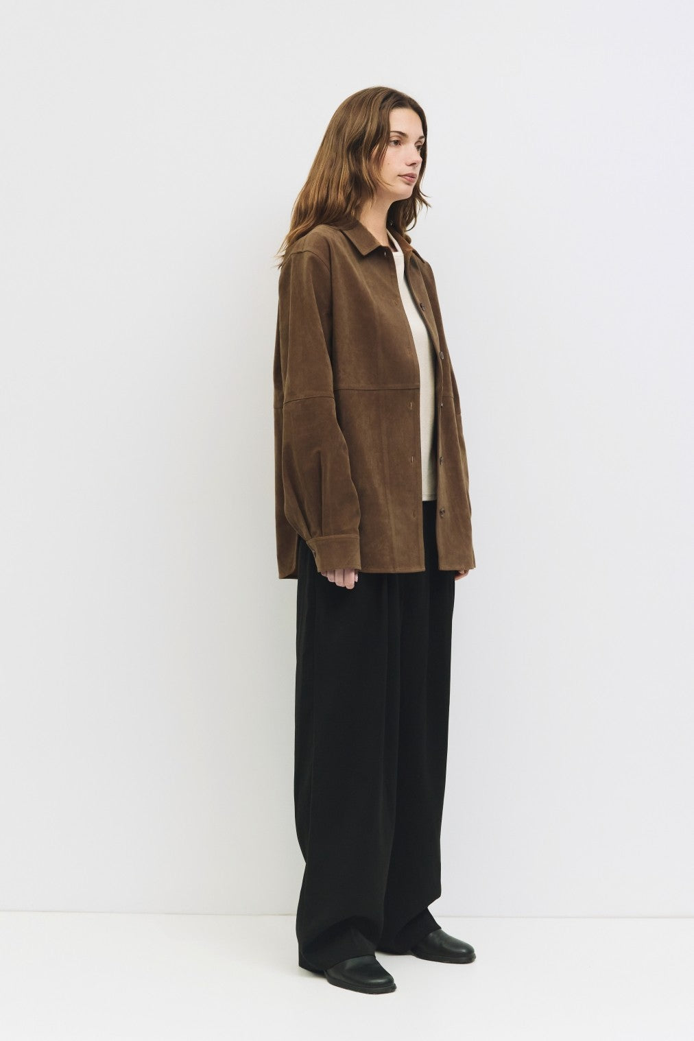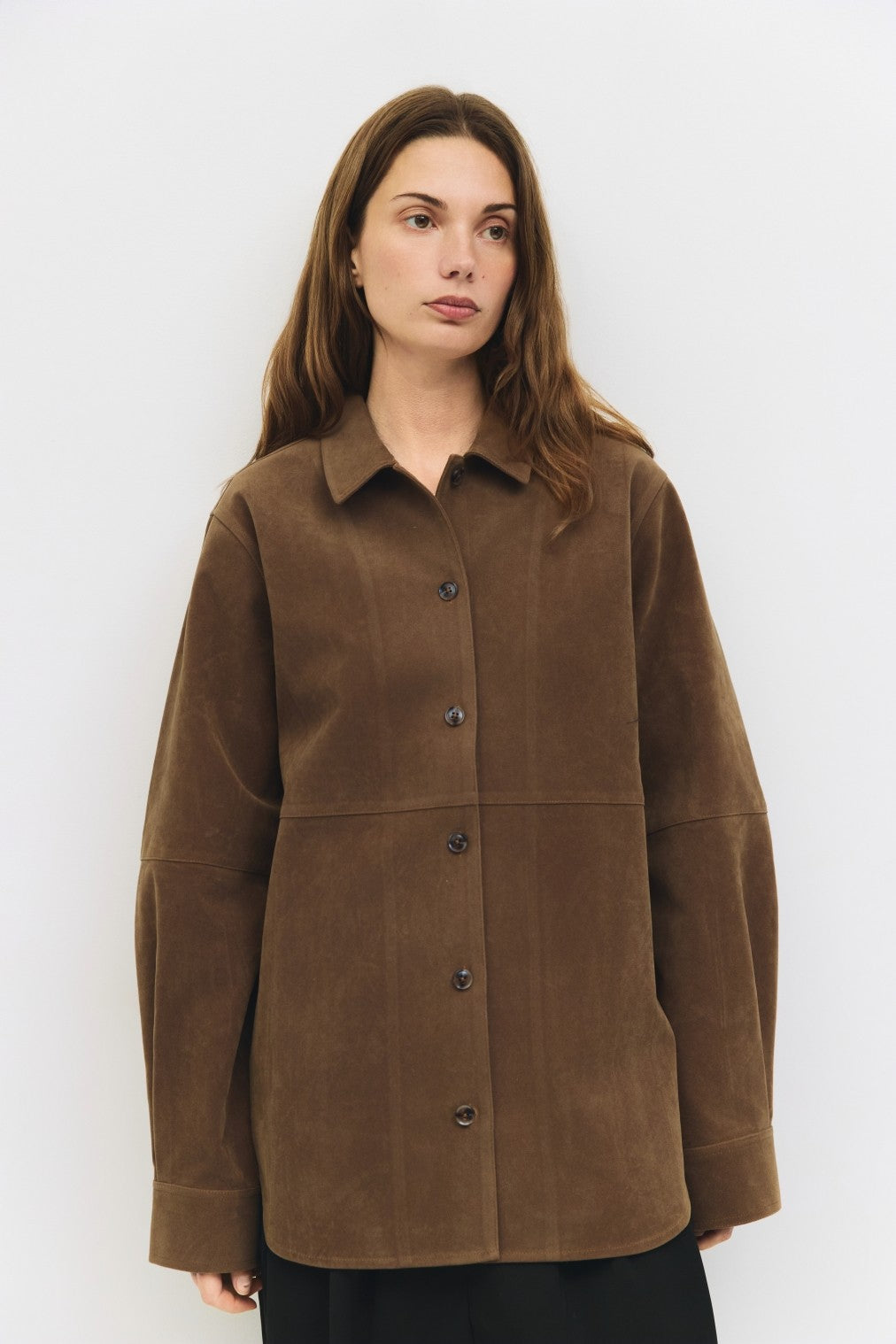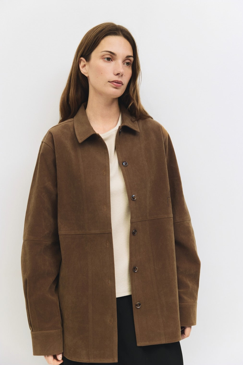 The Dean Jacket is an oversized button-down shirt jacket made from faux suede, featuring a classic collar and long sleeves. Its relaxed fit makes it an easy layering piece for everyday wear. Fabric Content: Self: 50% PVC, 40% Polyester, 10% Viscose Lining: 100% Polyester