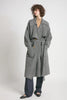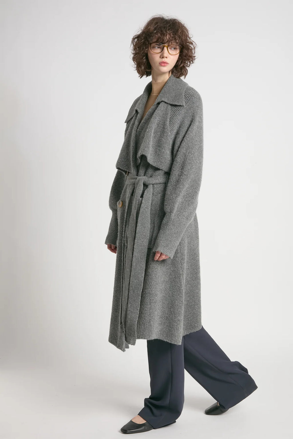 Trench-style cardigan coat. Double-breasted front with dropped shoulders, balloon sleeves, front pouch pockets, and softly flared silhouette