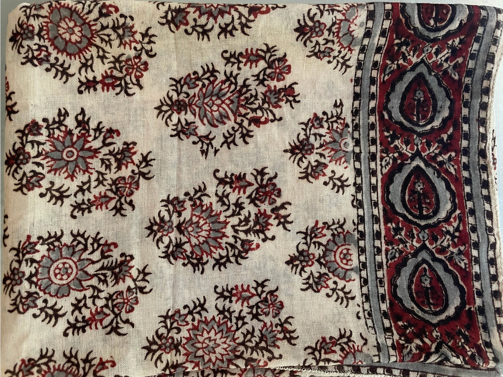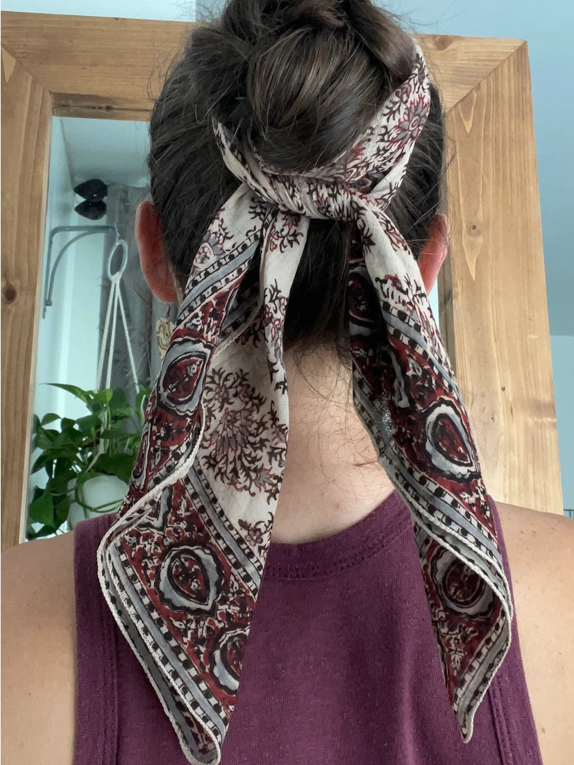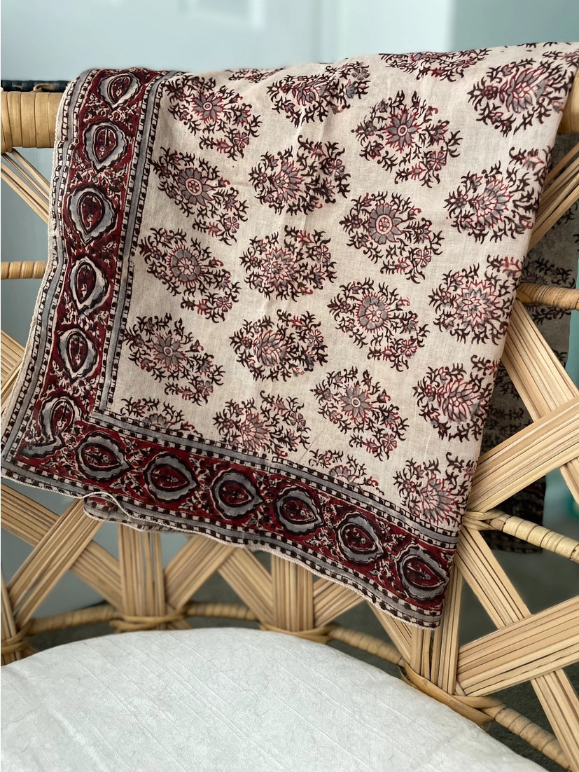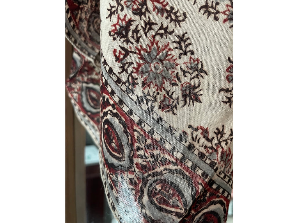 One of our most popular bandanas, the traditional floral paisley is wood block printed by hand onto a neutral ground.