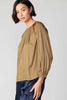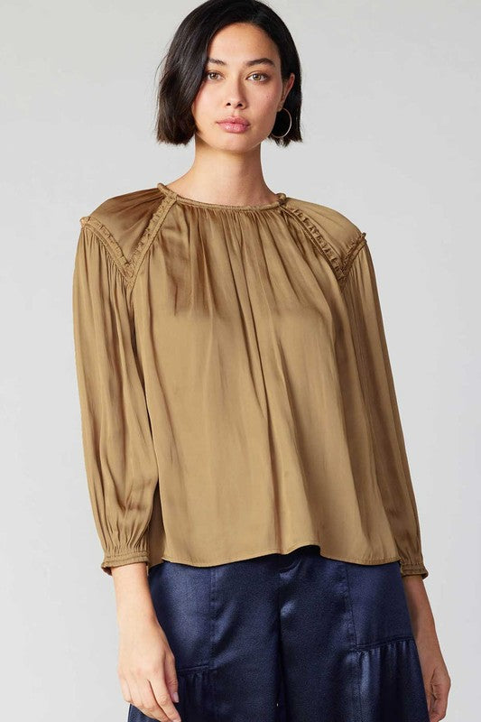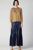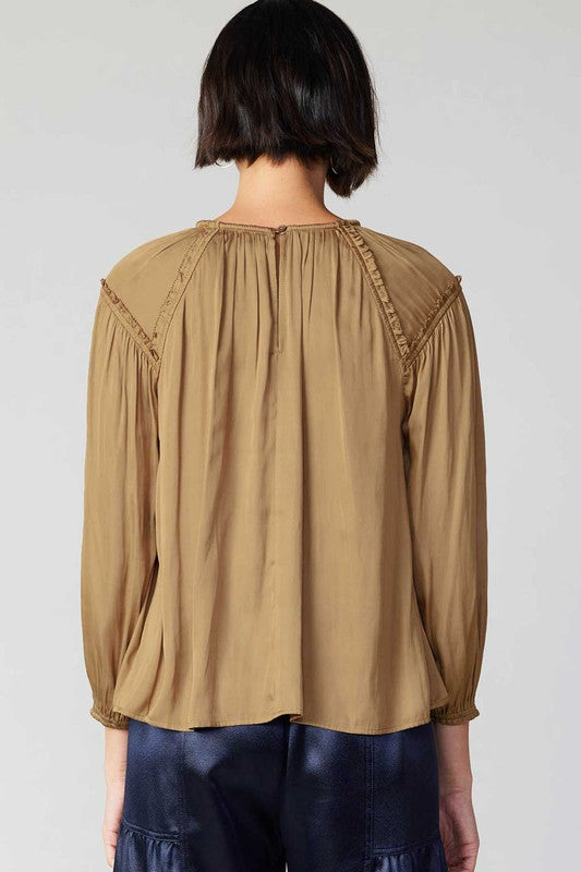 A lovely round neck three-quarter sleeves blouse with split neck opening with button closure, baby ruffle and rope detailing throughout.