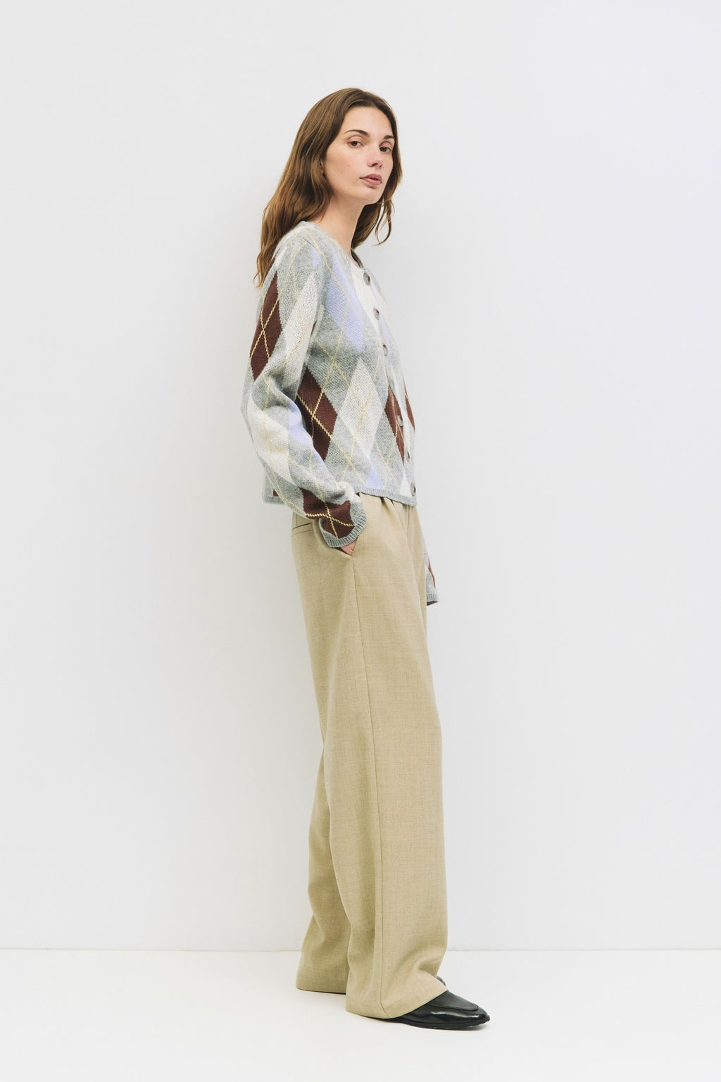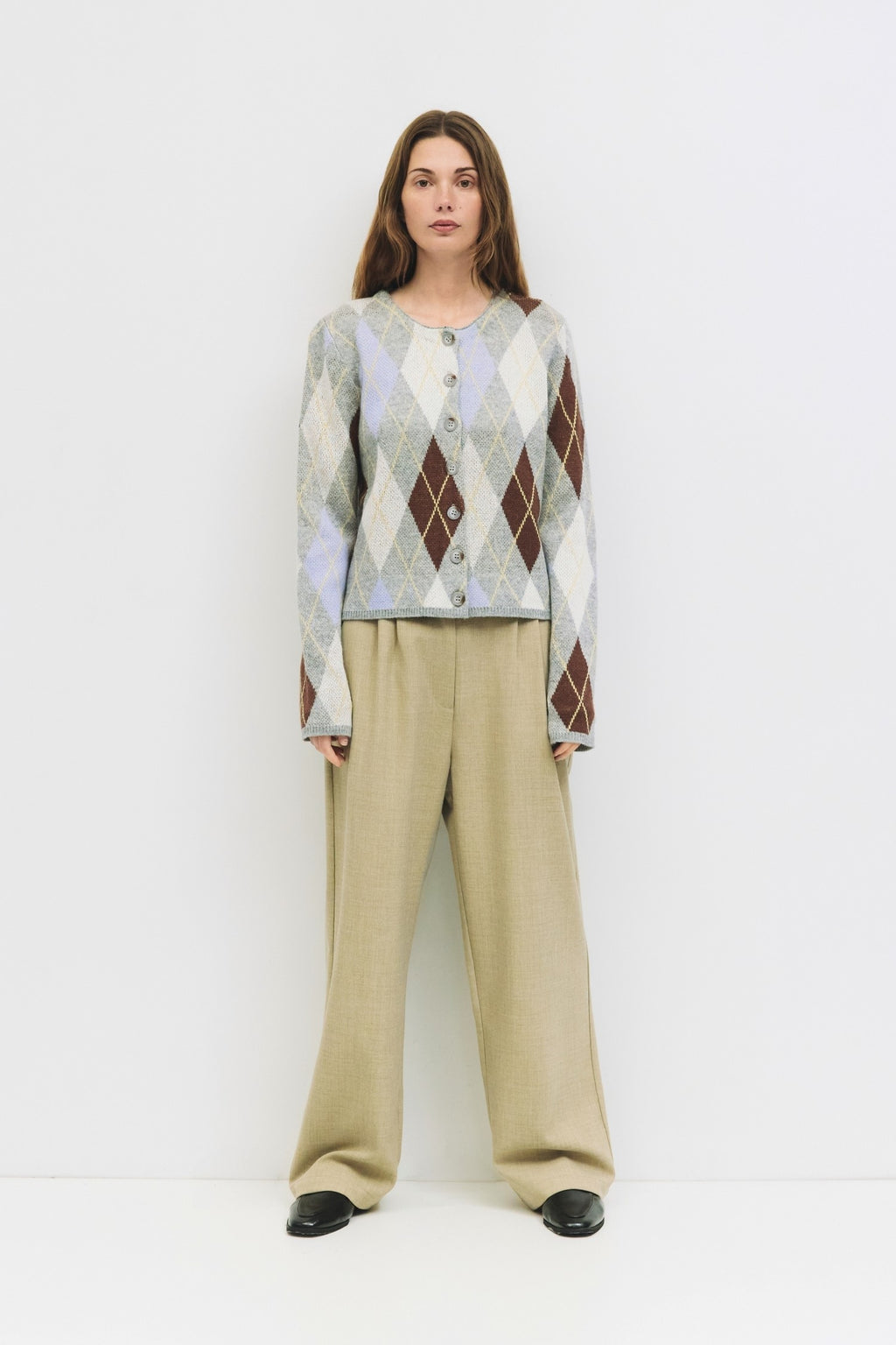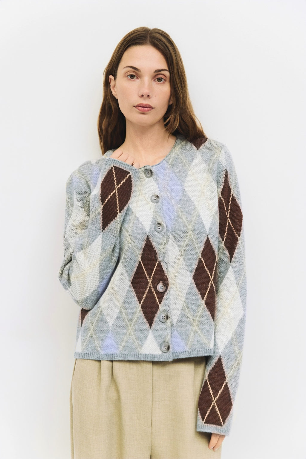 The Gayle Cardigan is a relaxed-fit knit featuring a classic argyle design. It has a crewneck, long sleeves, and a front button closure.