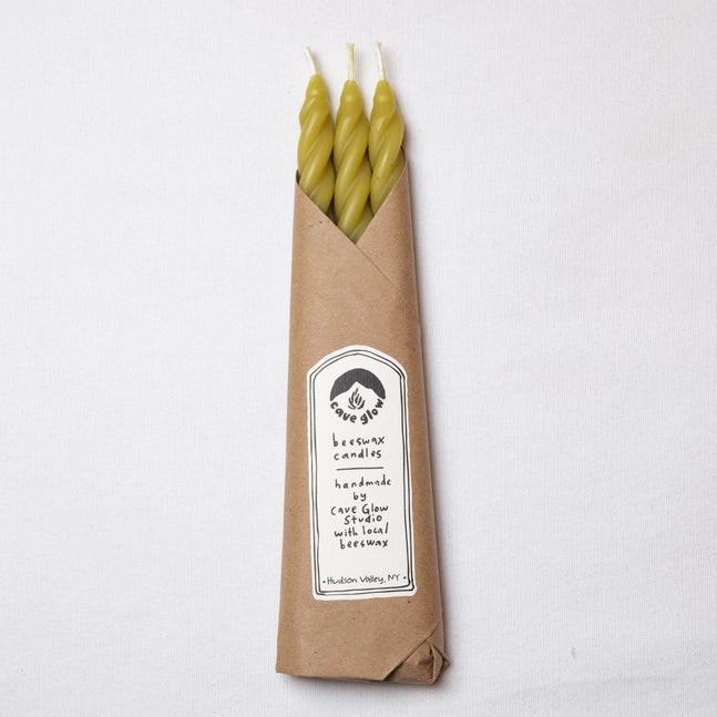 The Chartreuse Beeswax Spiral Set comes with three hand-crafted 9” beeswax candles. These candles are made with pure beeswax, cotton wicks and natural dye. Handcrafted in small batches in the Cave Glow studio located in High Falls, NY.