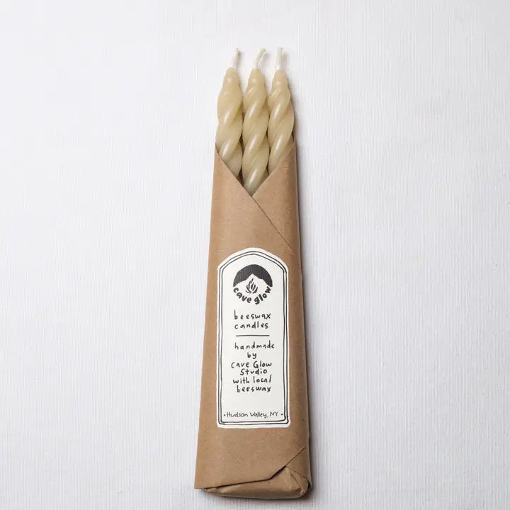 The Sand Beeswax Spiral Set comes with three hand-crafted 9” beeswax candles. These candles are made with pure beeswax, cotton wicks and natural dye. Handcrafted in small batches in the Cave Glow studio located in High Falls, NY.