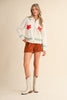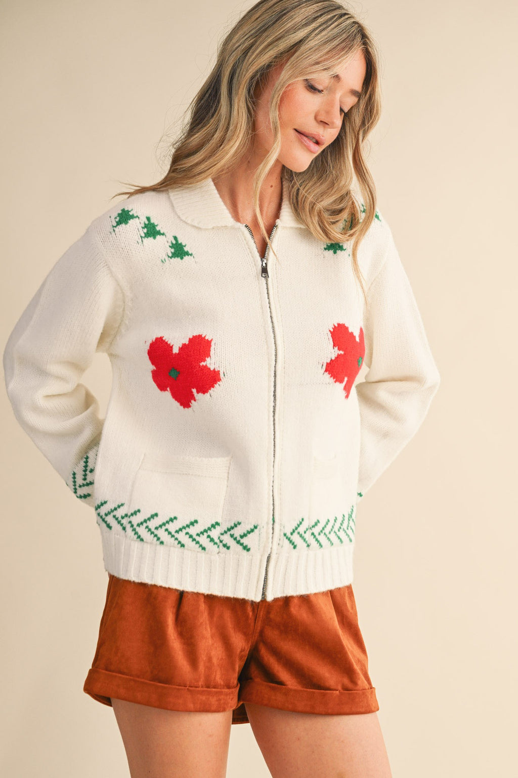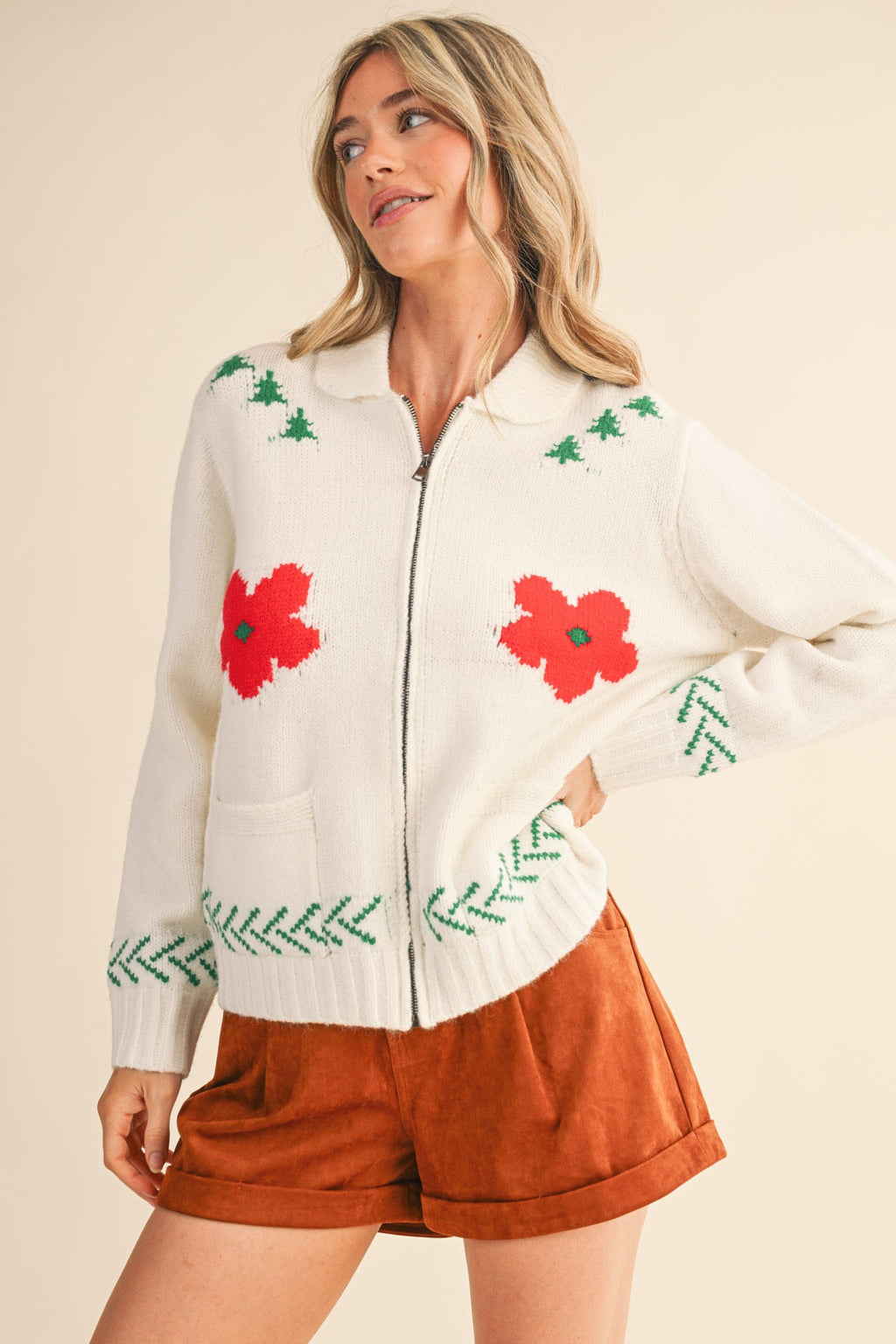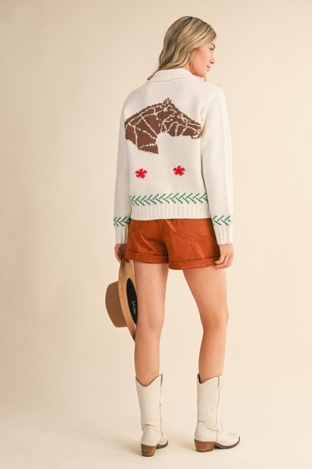 Horse and floral motif zip up sweater cardigan Ribbed collar Zipper closure Drop shoulder long sleeves Floral motif on front Horse motif on back Ribbed knit sleeve cuffs and hemFabric Content: 52% acrylic, 28% nylon, 20% pol